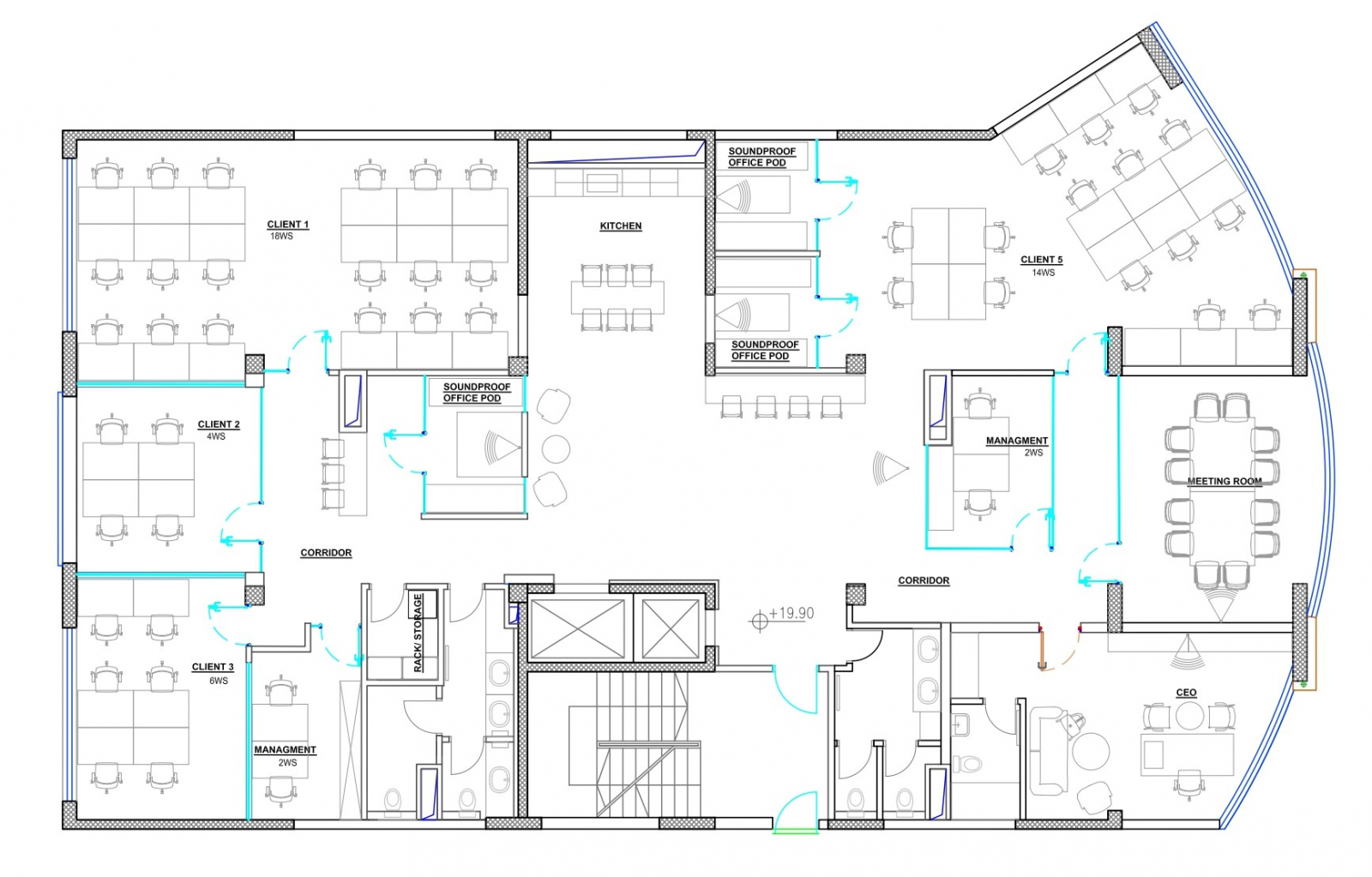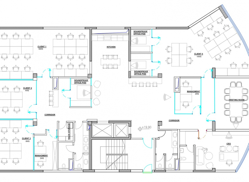 Вкупната површина изнесува 340м2 и располага со еден отворен простор, сала за состаноци, менаџерска канцеларија, две посебни канцеларии и тоалети.