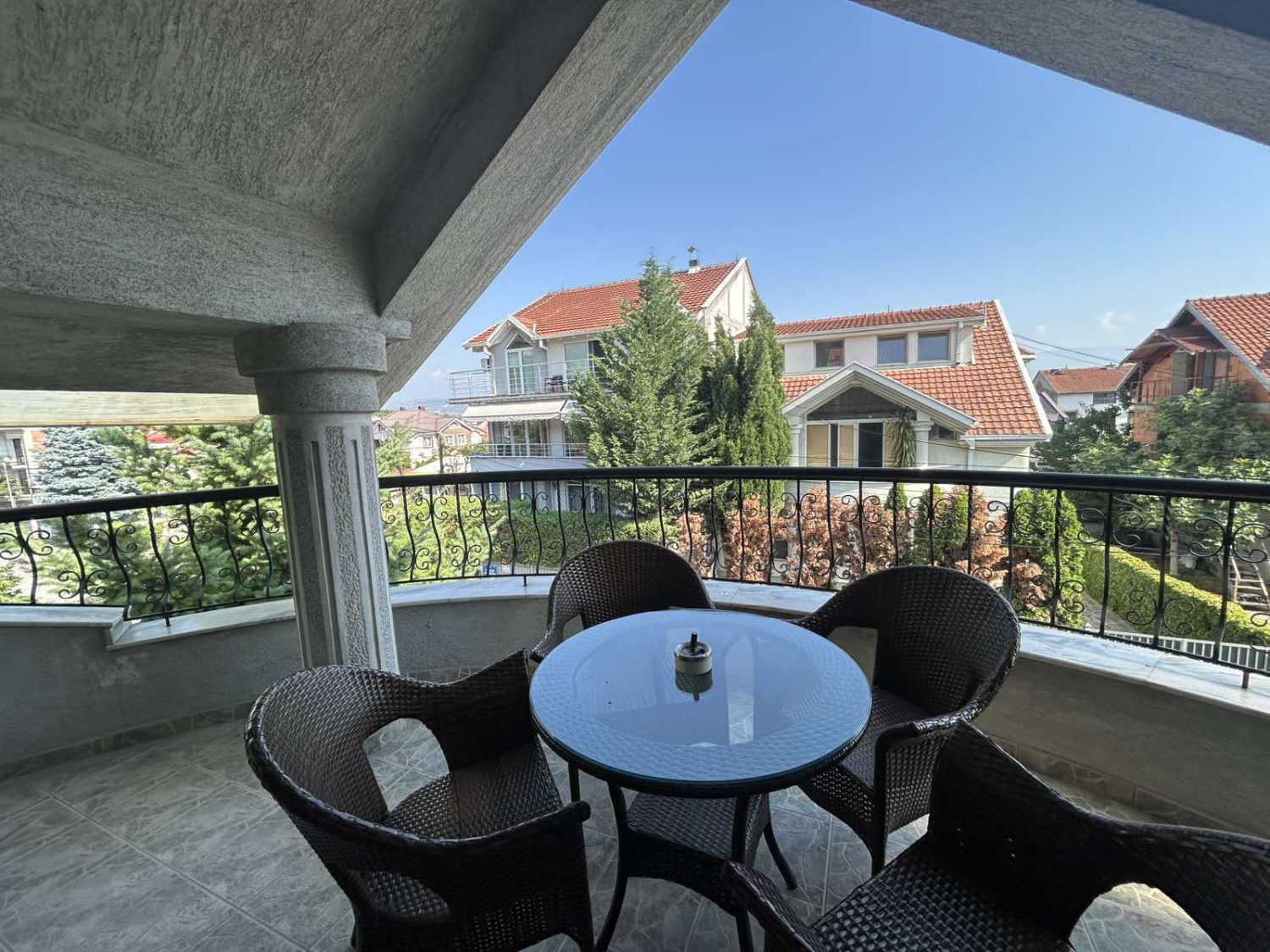 Прв кат: Втора дневна соба со трпезарија со излез на тераса, три спални соби – од кои две имаат сопствени тераси и приватни бањи.