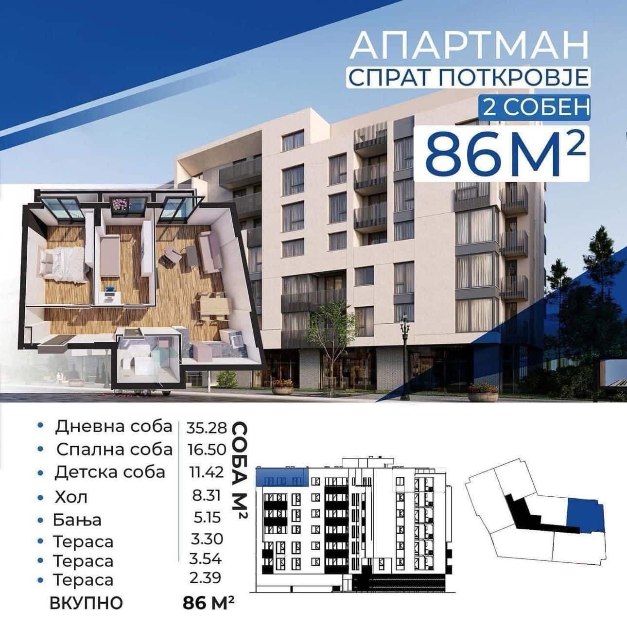 Станот располага со дневен престој, кујна, спална соба, детска соба, бања и 3 тераси.