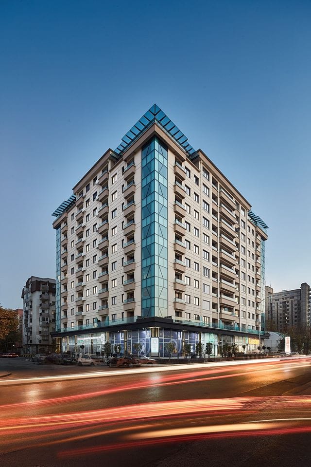 Објектот располага со 4 лифтови, по 2 во двата влеза во станбениот дел од зградата.