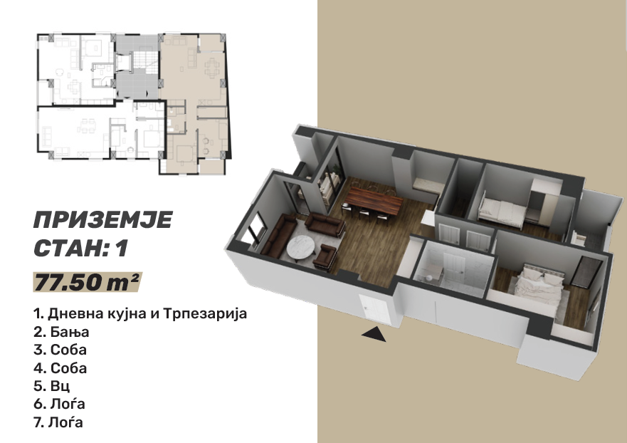 Стан 1 – 78м²: дневна соба, кујна со трпезарија, две спални соби, бања, тоалет и две тераси