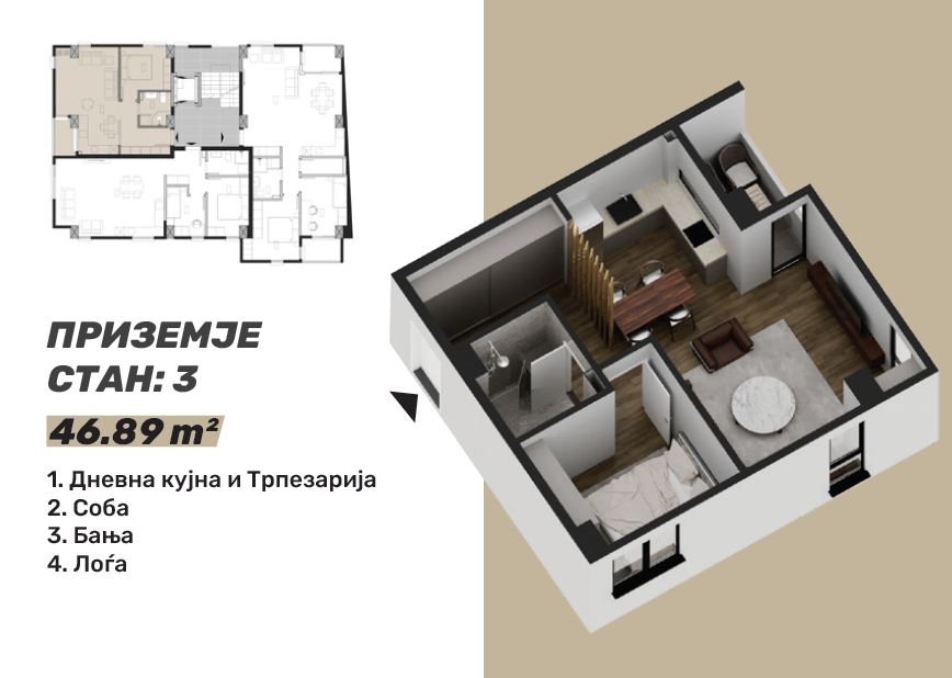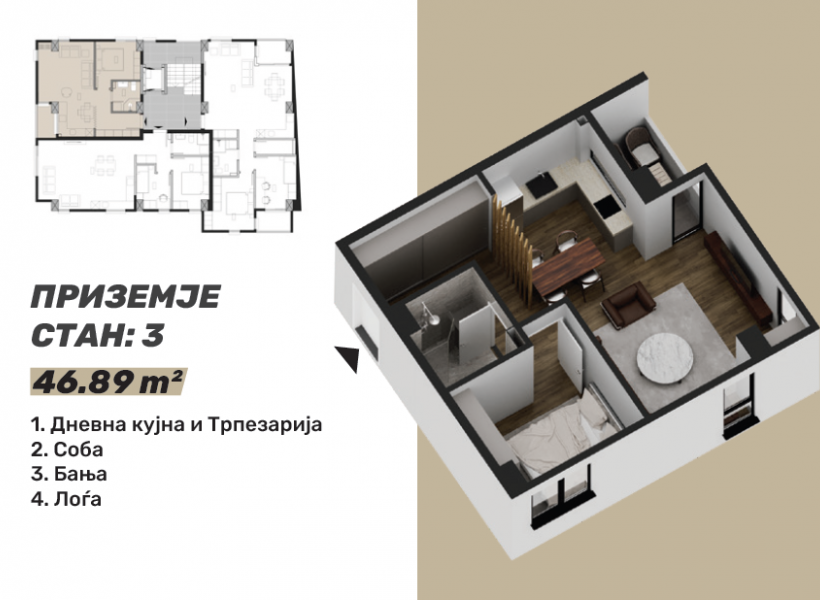 Стан 3 – 47м²: дневна соба, кујна со трпезарија, една спална соба, бања и терасаса