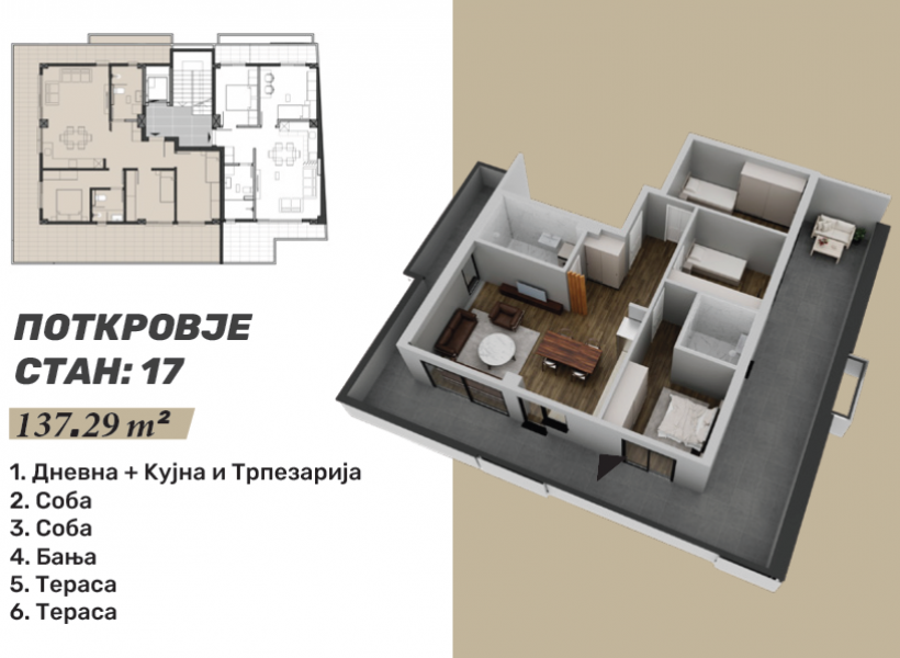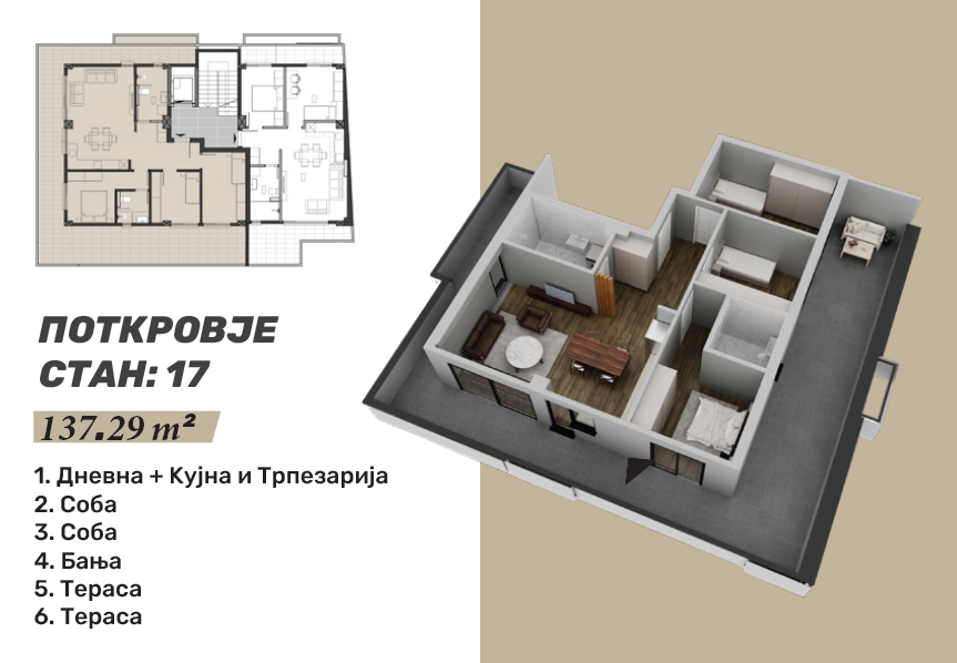 Стан 17 – 137м²: дневна соба, кујна со трпезарија, две спални соби, бања и две тераси