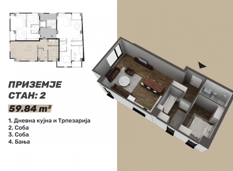 Стан 2 – 60м²: дневна соба, кујна со трпезарија, две спални соби и бања