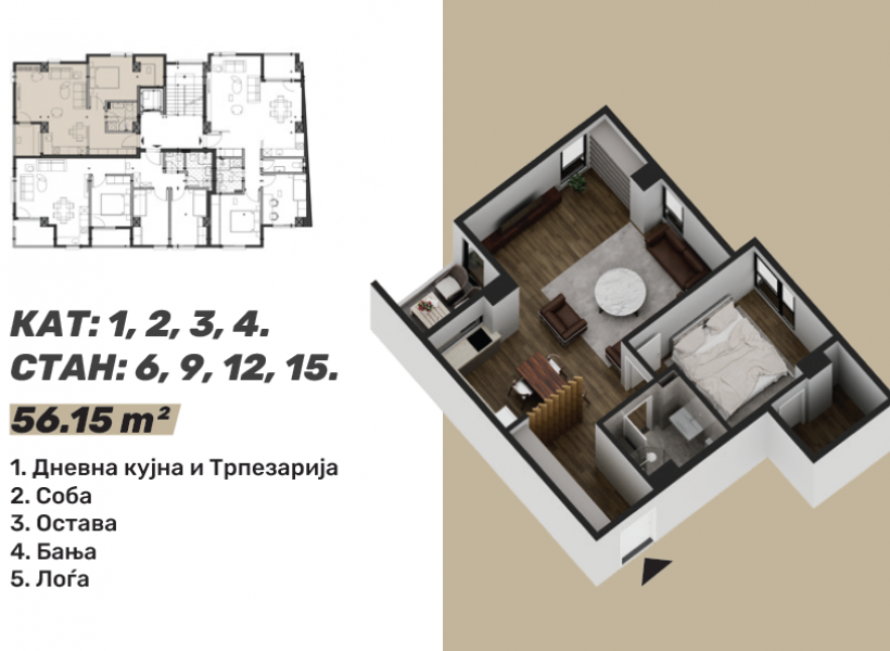 Стан 6 / 9 / 12 / 15 – 56м²: дневна соба, кујна со трпезарија, една спална соба, бања, остава и тераса