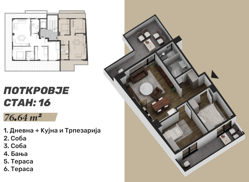 Стан 16 – 77м²: дневна соба, кујна со трпезарија, две спални соби, бања и две тераси