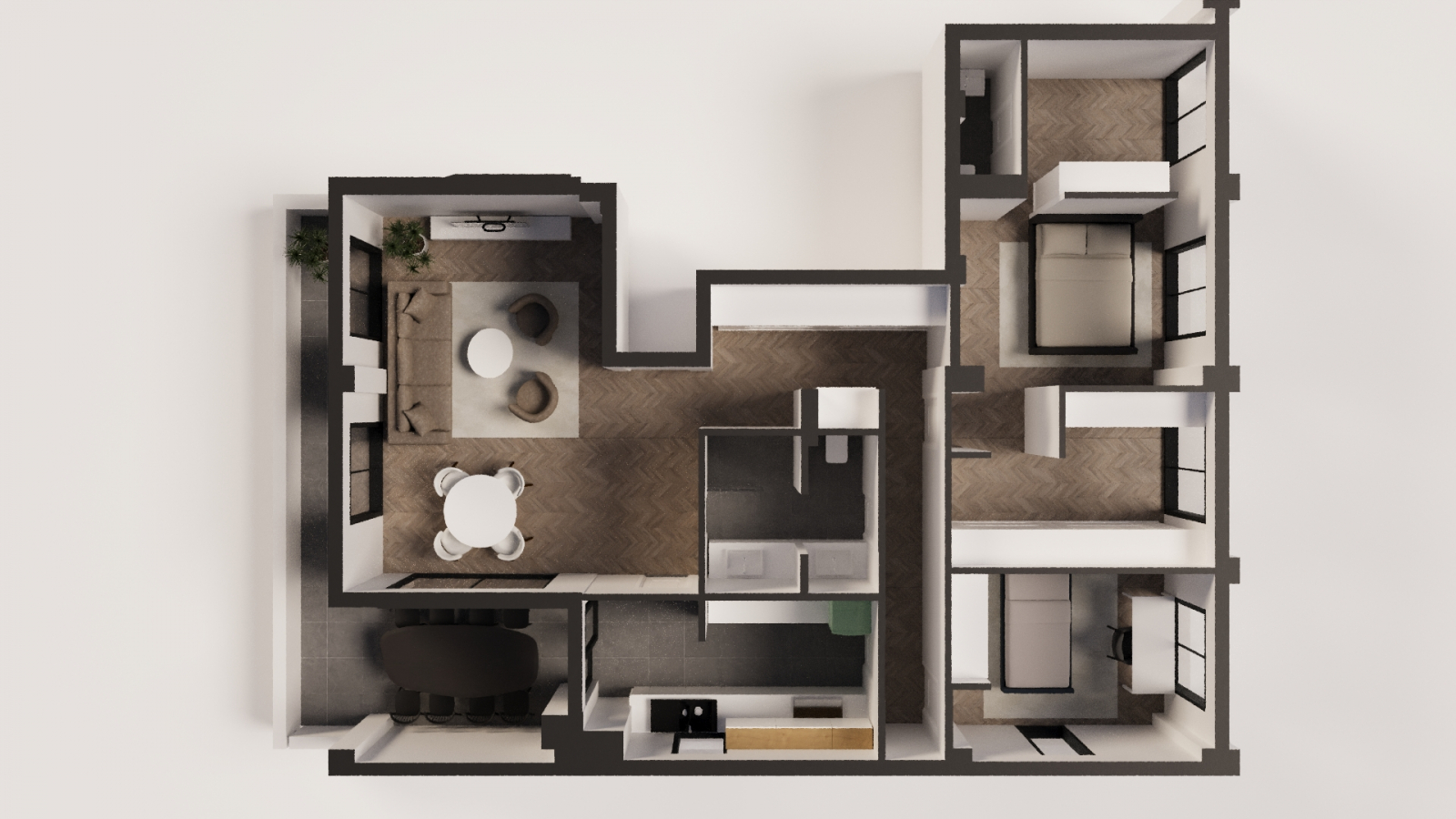 Станот располага со три спални соби, од кои едната спална со сопствен тоалет и простор за гардеробер, пространа дневна со трпезарија, одделна кујна, бања и тераса со површина од 18м2.