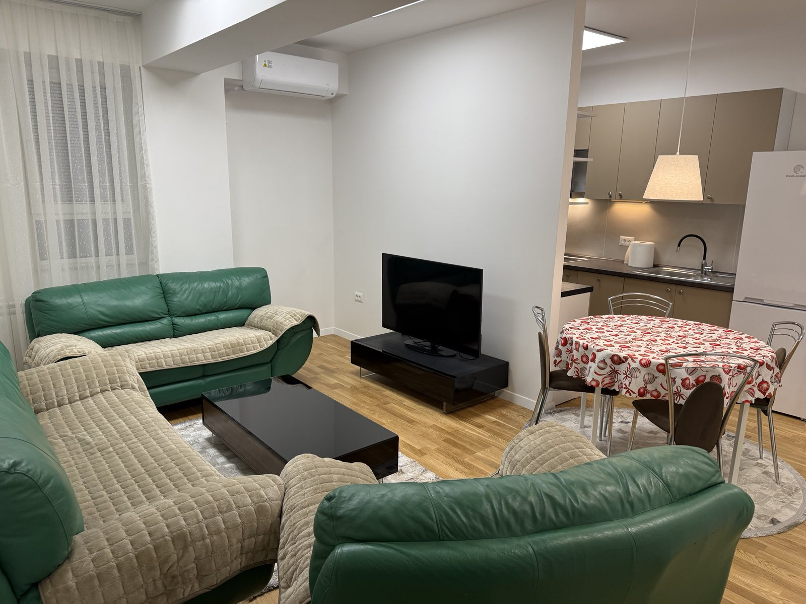 Греењето и ладењето се регулирани со централно градско парно и клима уреди.